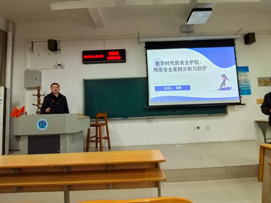 信息中心党支部刘攀老师以“数字时代的安全护航:网络安全案例分析与防护”为主题,向现代信息技术学院的同学们讲解了网络安全基础知识、常见场景案例、实用防护技巧、法律法规及诈骗预防等方面内容,旨在全方位提升同学们的网络安全意识及自我保护能力。