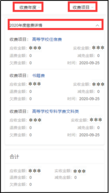 在缴费查询中可分年度、分项目查看缴费详情,包括住宿费、书籍费、学费等信息。