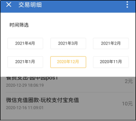 2.交易明细:可以按照时间筛选看到消费记录、消费地点、充值记录;
