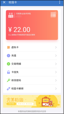 开企业微信,点击“工作台”,在“校园卡”界面,有充值、交易明细,还可以卡挂失、修改密码、校园卡解绑功能(温馨提示:初次使用需绑定校园卡账号,默认密码:666666)
