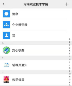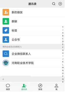 5.在微信“通讯录”中选择“河南职业技术学院”,进入学校企业微信号,然后选择“辅导员通知”。