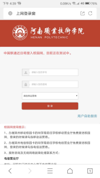 2.确认连接无线之后,使用浏览器输入1.1.1.1,这时会弹出下面的登录界面。输入工号和密码,老师使用自己的工号和密码,学生使用自己的学号和密码(学生需要选择运营商)登录无线网络。