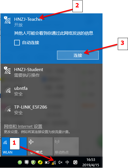 1.在电脑的右下角找到如“1”所示的图标,点击之后打开无线选择页面,找到HNZJ-Teacher如图“2”,点击连接。学院学生请连接HNZJ-Student无线信号。