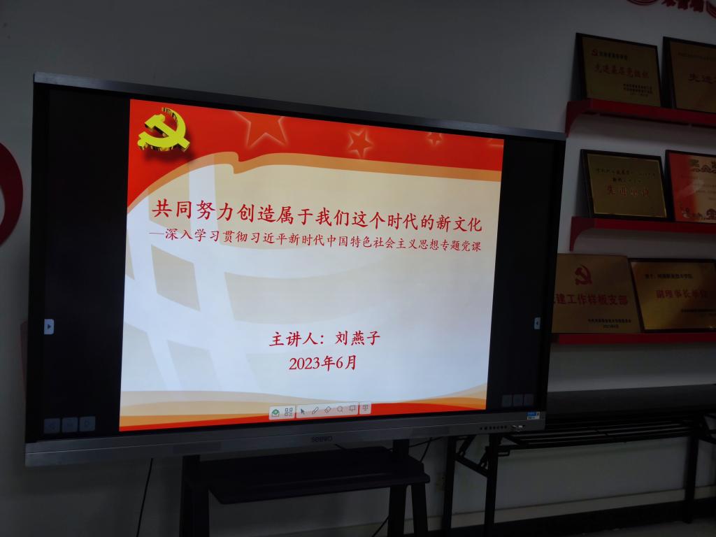教师党支部书记刘燕子以“共同努力创造属于我们这个时代的新文化”为题,围绕习近平总书记在文化传承发展座谈会上的重要讲话讲了专题党课。习近平总书记指出,我们的社会主义为什么不一样?为什么能够生机勃勃充满活力?关键就在于中国特色,中国特色的关键就在于两个结合。只有植根本国、本民族历史文化沃土,马克思主义真理之树才能根深叶茂。新征程上要坚定文化自信、秉持开放包容、坚持守正创新,共同努力创造属于我们这个时代的新文化。