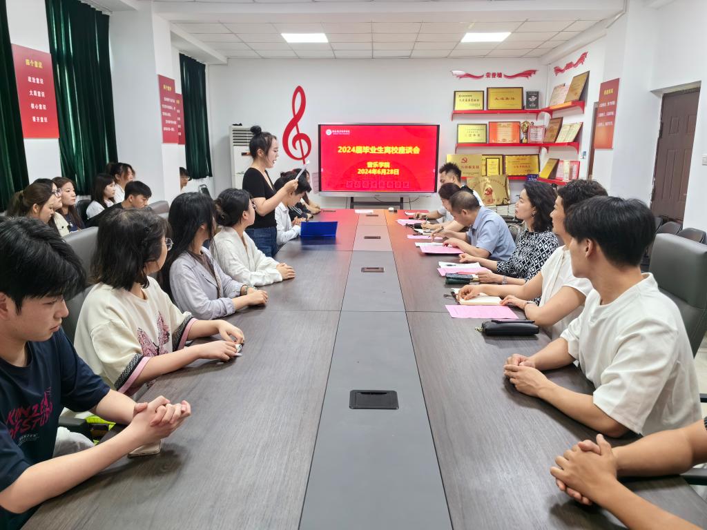 为加强毕业生的离校教育,确保毕业生顺利离校,6月28日上午,音乐学院在A403召开2024届毕业生离校座谈会,院长杨燕、党总支书记张俊峰、副院长刘燕子、党总支副书记祁姗姗、办公室主任殷广乐、辅导员老师高原出席会议。会议由高原主持。在校生代表及19名毕业生代表参加会议。