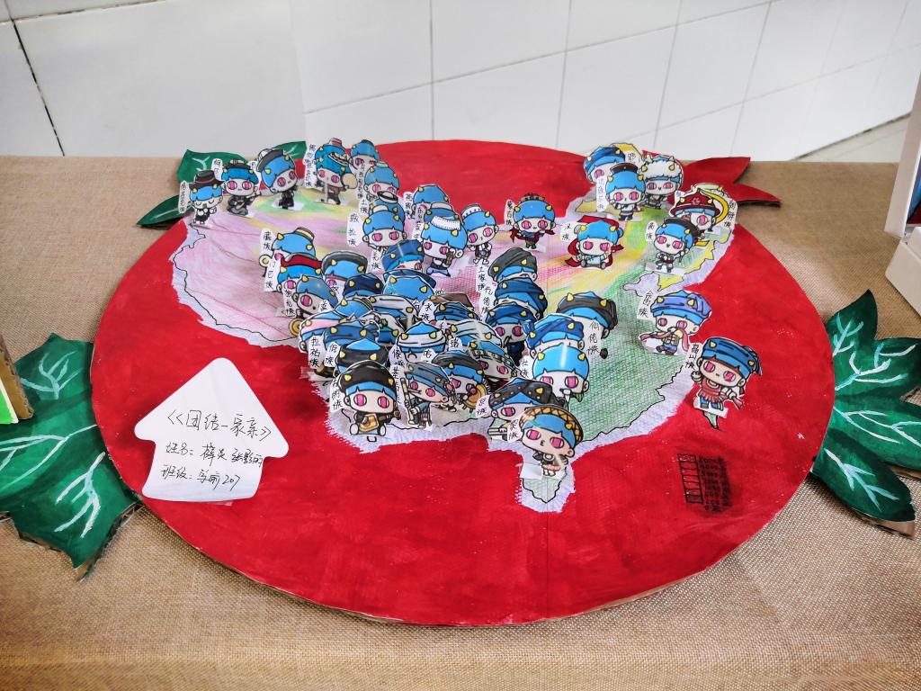 除了舞台上精彩的展现,学前教育专业的20级、21级全体同学还参与了“民族团结”主题的环创手工制作,所有作品于5月22日至23日在音乐楼一楼大厅进行展览。同学们充分利用废旧纸箱、卡纸、轻粘土、颜料等材料,精心构思,巧妙设计,紧扣民族团结主题,用一件件精工细作的作品表达对祖国、对党的歌颂与热爱之情。