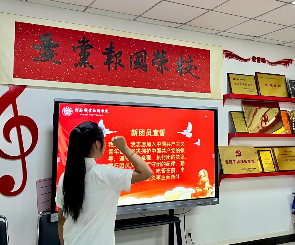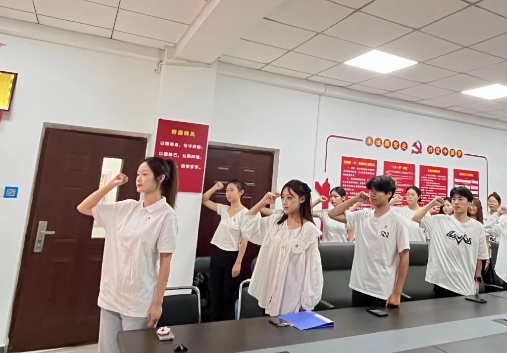 在神圣的团歌声中,学院党总支副书记祁姗姗、团总支书记张洁共同为新团员代表佩戴上熠熠生辉的团徽。这枚象征着责任与使命的徽章,标志着他们正式成为共青团组织的一员。随后,全体新团员在何雯丽的领誓下,面向鲜红的团旗,举起右拳,庄严宣誓:“我志愿加入中国共产主义青年团,坚决拥护中国共产党的领导……为共产主义事业而奋斗!”铿锵誓言回荡在会场,表达了他们坚定的理想信念和奋斗决心。