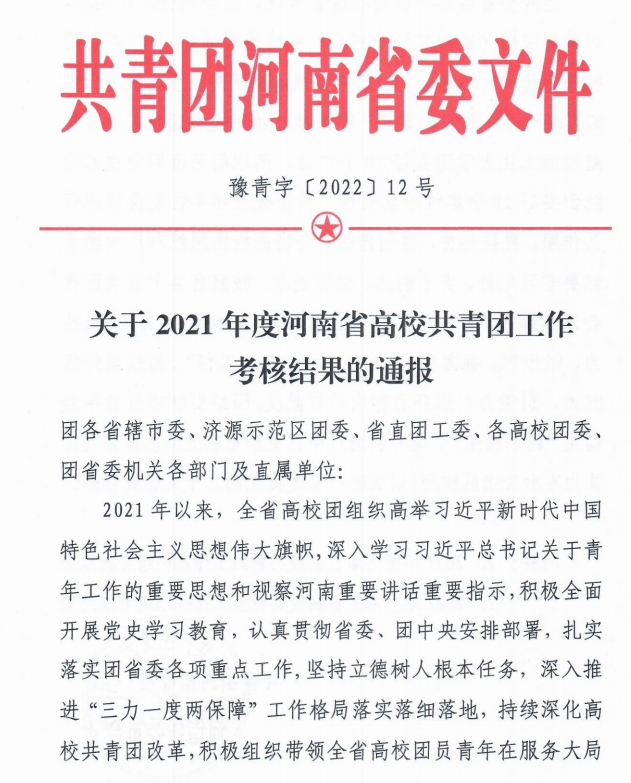 3月11日下午,团省委召开2022年全省高校共青团工作视频会议,公布了2021年度河南省高校共青团工作考核结果,我校获“优秀”等级。校团委负责人在会上作了题为《深入践行“3个3”工作体系,努力提升学生会服务水平》的交流发言。