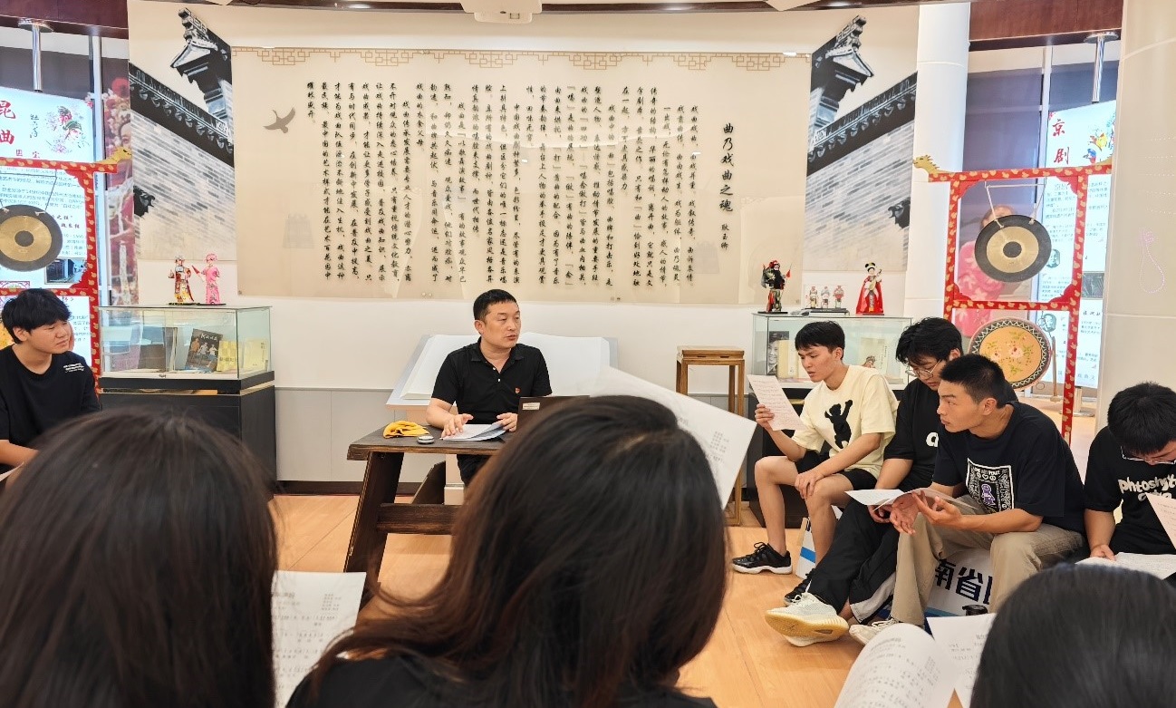 图2魏振雷老师在戏曲音乐文化的校园传播展览馆带领社团成员学唱经典作品