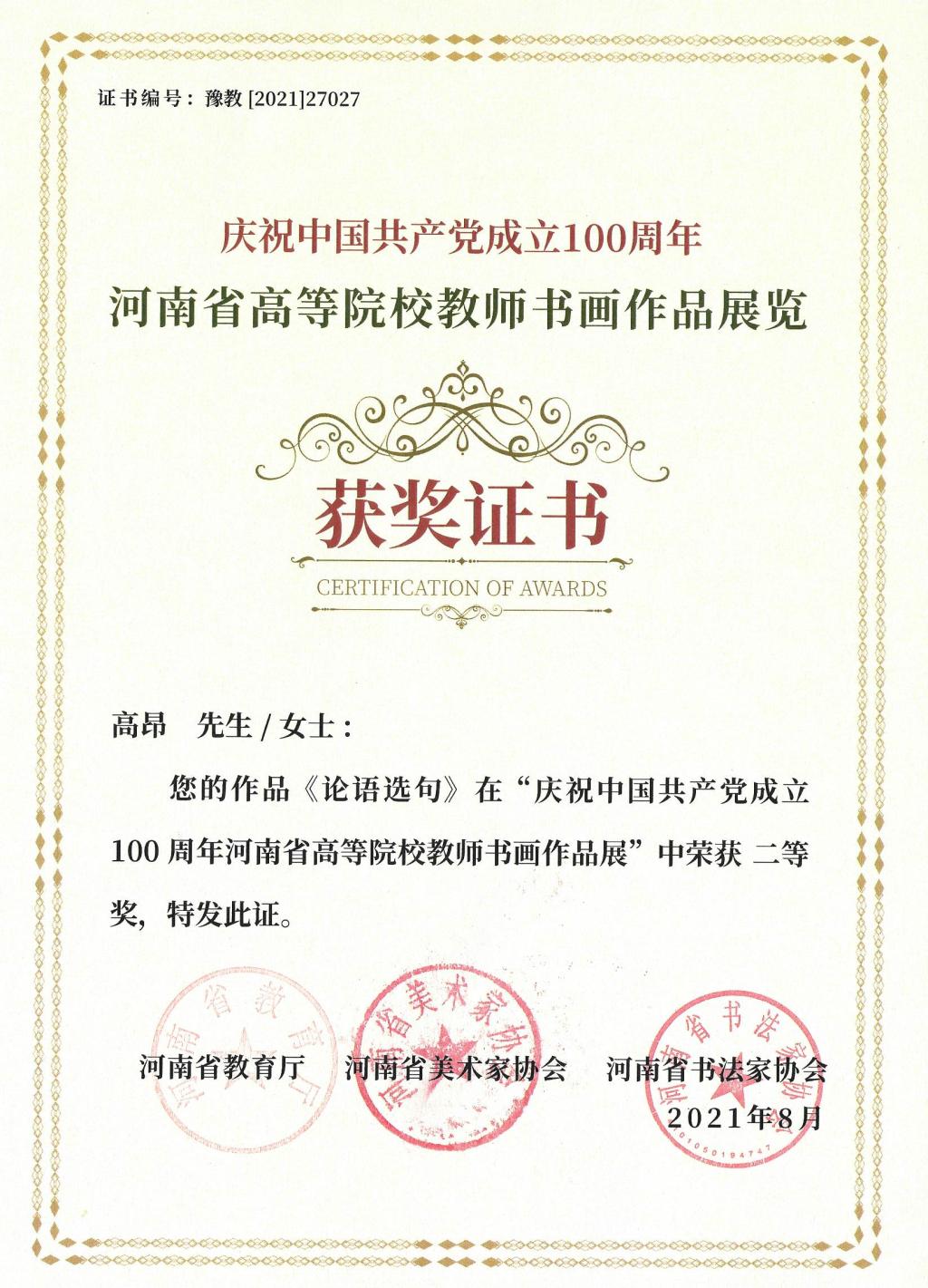 近日,河南省教育厅发文公示了庆祝中国共产党成立100周年河南省高等院校教师书画作品展览评审结果,我校教师高昂荣获书法类二等奖,年小娈荣获书法类三等奖。
