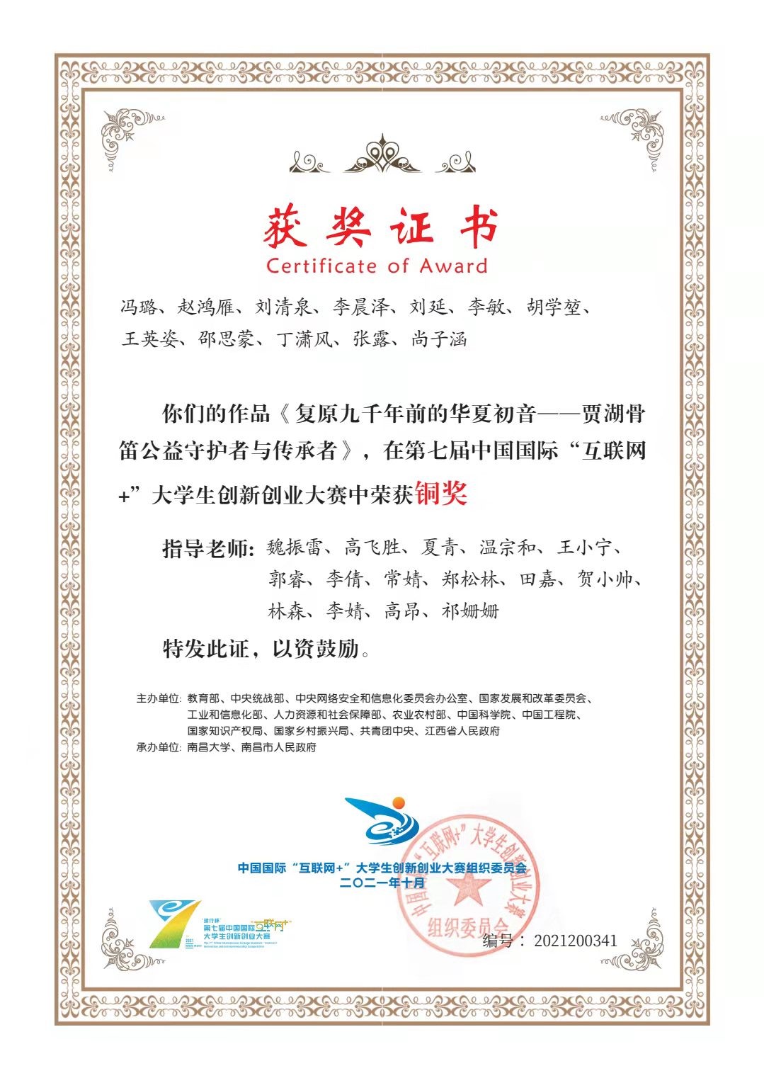 第七届中国国际“互联网+”大学生创新创业大赛由教育部、中央网信办、国家发改委、工信部、人社部等13个部(委、省)主办,大赛以“我敢闯、我会创”为主题,是一次备受瞩目的国际赛事。据悉,来自121个国家和地区的4347所高校、228万余个项目、956万余人次报名参赛。其中,由音乐学院(公共艺术教育部)魏振雷老师指导的《复原九千年前的华夏初音——贾湖骨笛公益守护者与传承者》项目,在第七届中国国际“互联网+”大学生创新创业大赛中荣获铜奖。