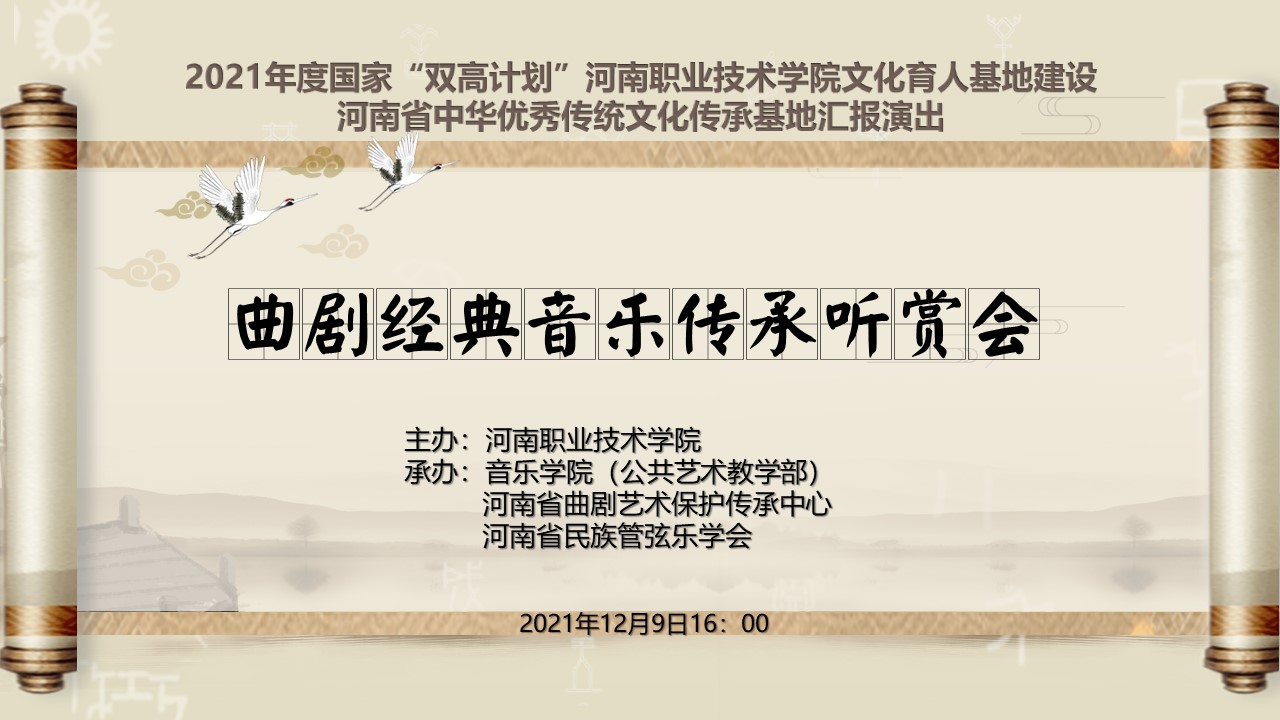 2021129日,在迎中国共产党成立100周年之际,河南职业技术学院音乐厅举办2021年度国家双高计划河南职业技术学院文化育人基地建设暨河南省中华优秀传统文化传承基地汇报演出《曲剧经典音乐传承听赏会》,本次活动是由河南职业技术学院主办,音乐学院(公共艺术教学部)、河南省曲剧艺术保护传承中心、河南省民族管弦乐学会联合承办。