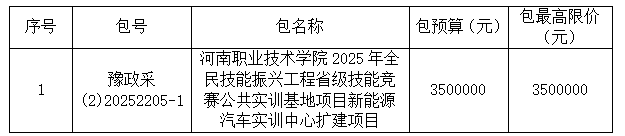 河南职业技术学院2025年全民技能振兴工程省级技能竞赛公共实训基地项目新能源汽车实训中心扩建项目招标项目的潜在供应商应在河南省公共资源交易中心网(http://www.hnggzy.net)获取招标文件;并于2025年12月16日09时00分(北京时间)前递交响应文件。