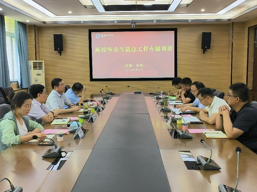 6月14日,省人社厅就业促进局四级调研员张锋带队到我校开展高校毕业生就业工作专题调研,全面了解河南职业技术学院、河南经贸职业学院、郑州铁路职业技术学院三所高校毕业生就业工作开展情况。省社科院人口与社会发展研究所所长、研究员陈东辉、副研究员张侃、实习员郝莹莹陪同调研。