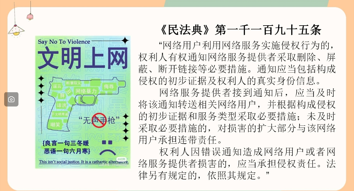 这次活动让学生深刻认识到网络是一把双刃剑。在享受网络带来便利的同时,也需提高警惕,遵守网络文明规则。在今后的网络生活中,能更好地保护自己,同时为营造健康、文明的网络环境贡献自己的力量。(撰稿:王枫审稿:刘蕤)
