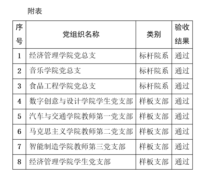 根据《关于开展第二批校级党建工作标杆院系和第三批样板支部验收考评工作的通知》要求,学校开展了标杆院系和样板支部验收考评工作。经基层党组织申报、党总支推荐、专家评审等程序,3个校级标杆院系和5个校级样板支部验收通过(具体见附表),现予以公示,公示期间如有异议,请联系党委组织部。
